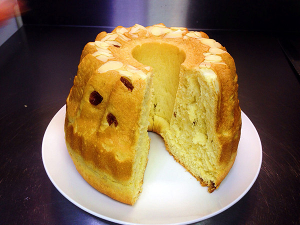 面包机后油法揉面,撒上朗姆酒泡过的葡萄干和杏仁碎,揉好后发酵10-15分钟