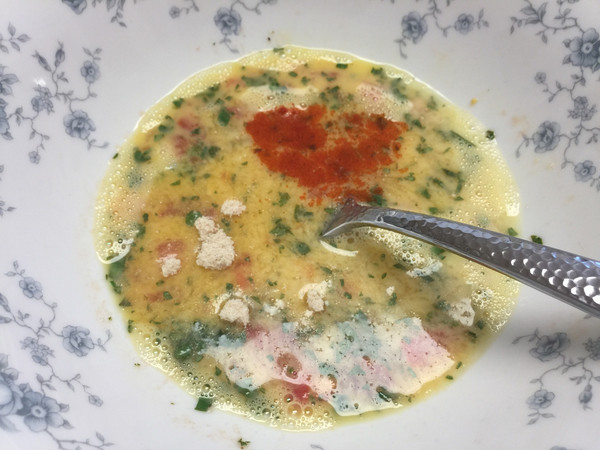 加入鸡粉,红椒粉(可以省略),我是爱吃辣的。把鸡蛋液打匀