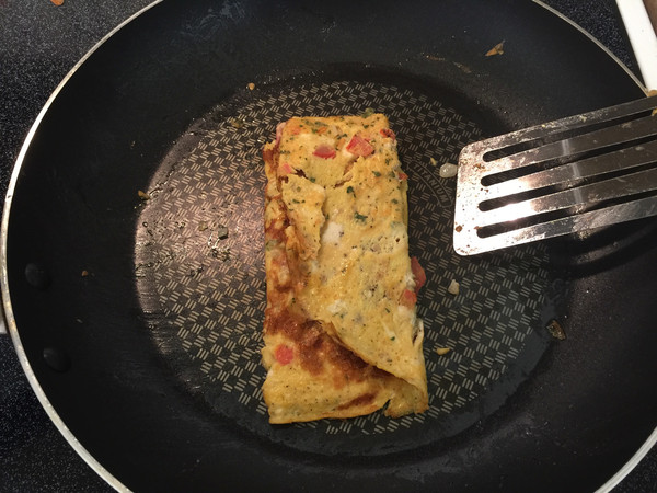把鸡蛋皮三折,左边搭到右边,右边搭到左边。如果不成型也没关系,不影响味道的。