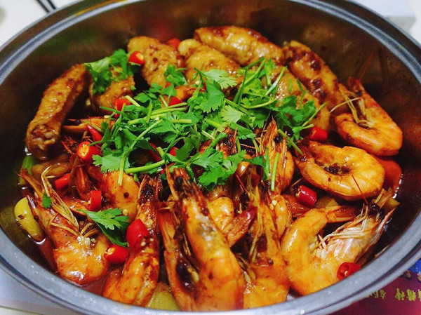 用的是电磁炉,方便!锅里放入黄油或色拉油,加入葱姜蒜然后把青菜炒至3分熟。把鸡翅铺在上面,加点水小火焖10分钟。打开锅盖放入海虾,抹上调制好的酱汁,再盖上锅盖焖10分钟。