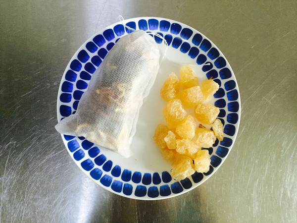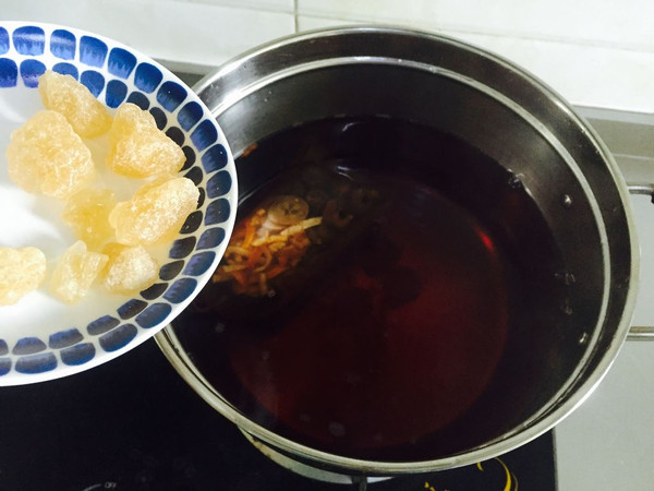 在最后5分钟时加入100g黄冰糖,冰糖不会上火。这个量、不是太甜,喜甜的可以增加50g
