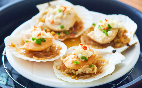放入蒸锅,大火蒸5分钟后出锅,将调味汁趁热浇在扇贝上,撒上葱花和红椒即可。