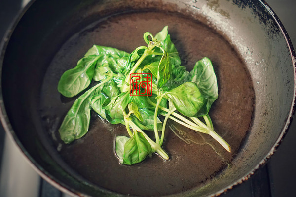 热锅起油先放入罗勒叶,我希望让油的味道中有罗勒的香气在,让罗勒的味道去影响肉的味道。