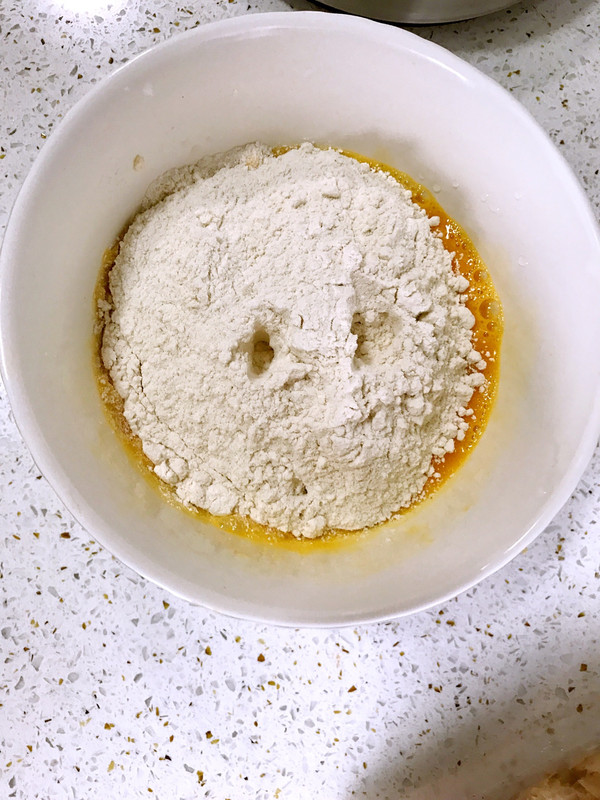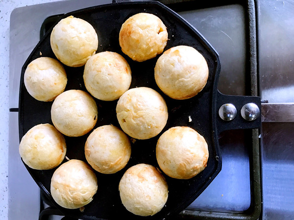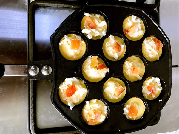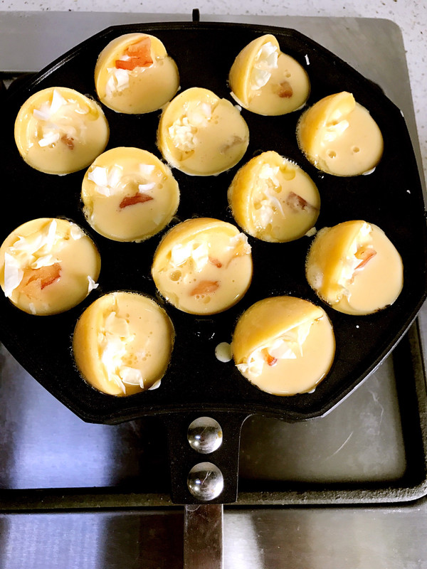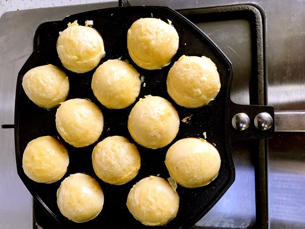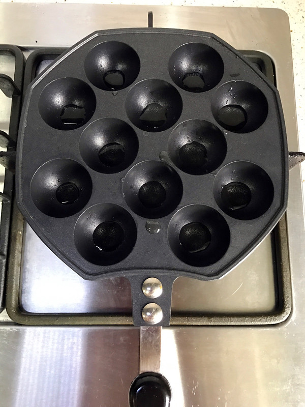 模具洗净,燃气炉开小火烘干烤盘(全程一直最小火,大火容易焦),滴入孔的五分之一的油