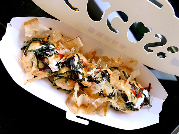 挤上章鱼烧酱,挤上沙拉酱、番茄酱、芥末,撒上木鱼花和海苔丝,美味无比呀!开始享受吧……