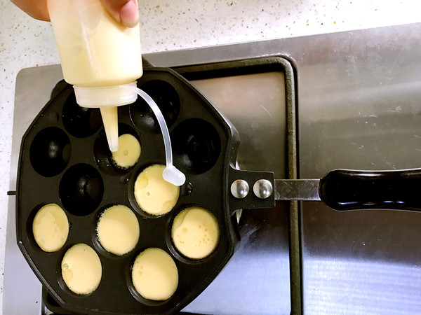 倒入章鱼烧粉,然后一起搅拌均匀,慢慢加水,没有结块后把水一次加完,加3滴章鱼烧酱(看个人喜好,可以不加),搅拌成丸子糊,把面糊倒入量杯中或者挤酱瓶中