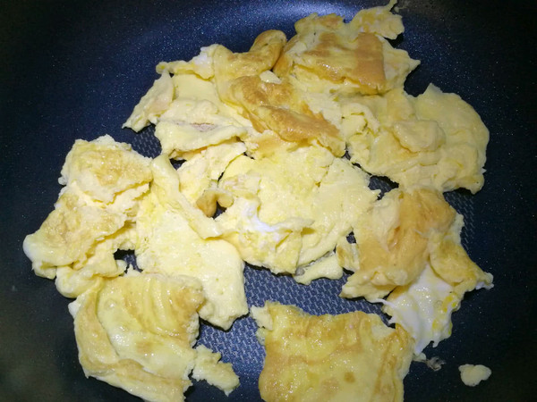 热锅放油,放入蛋液,待底部凝固后炒散成块,盛出备用。