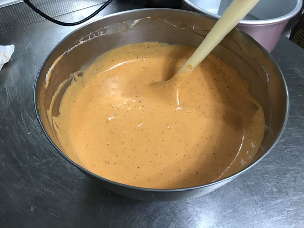 蛋白霜取三分之一倒入蛋黄糊中,翻拌均匀