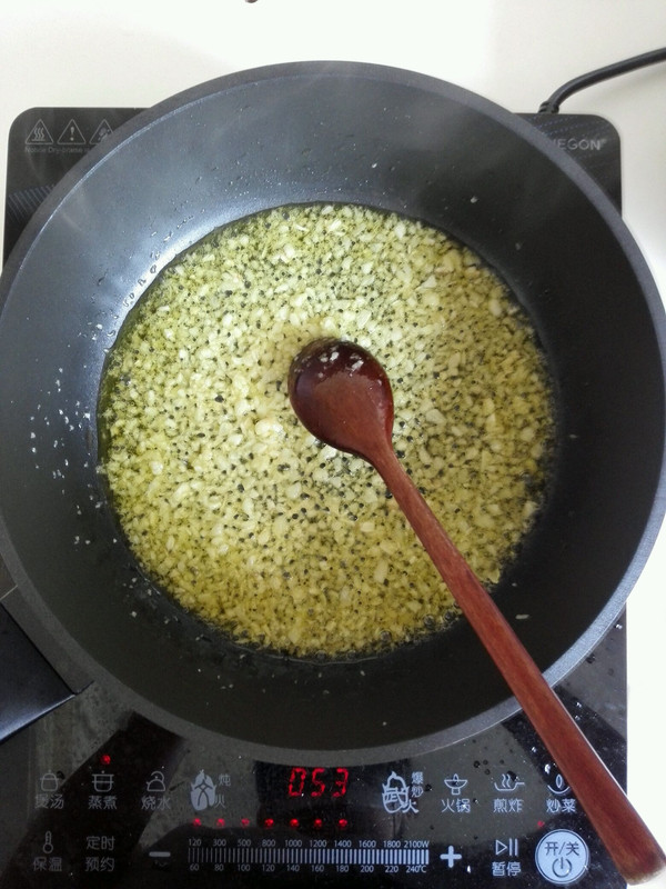 锅里放油,量比平时炒菜多,将加了盐的蒜、姜一半末入锅炒,