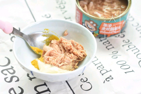 1.金枪鱼滤去油,与蛋黄酱,芥末酱混合均匀,