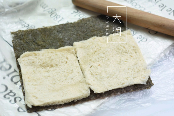 4.在操作台上,铺上一张寿司紫菜,上面放上面包片2片,用檊面棍压薄