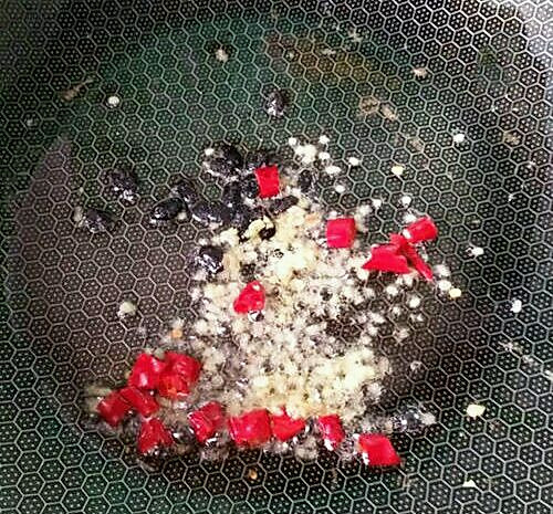 再起锅,入底油,下入姜末,红辣椒段,少量豆豉,一少勺郫县豆瓣酱,小火炒出红油~