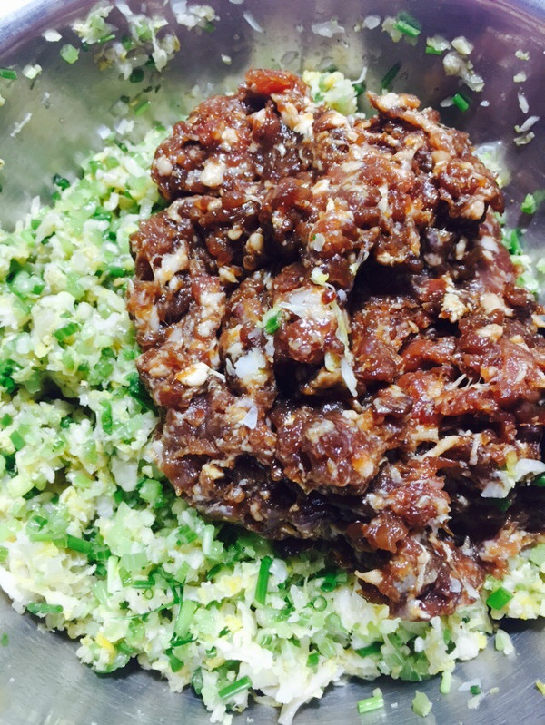 加入肉馅 适量盐(盐要少放 芹菜杀水时已经加过盐了 酸白菜也有盐味)