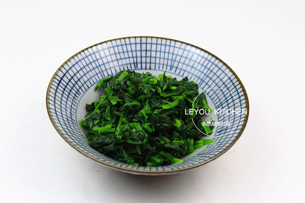 将菠菜焯水备用。(菠菜中含有大量的草酸,所以,建议在食用前先焯下水。另外,焯水后再做鸡蛋糕也更容易成型。)