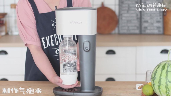 然后用sodasoda气泡机把纯净水制作成气泡水,只要轻轻按压几下纯净水就变成气泡水啦~