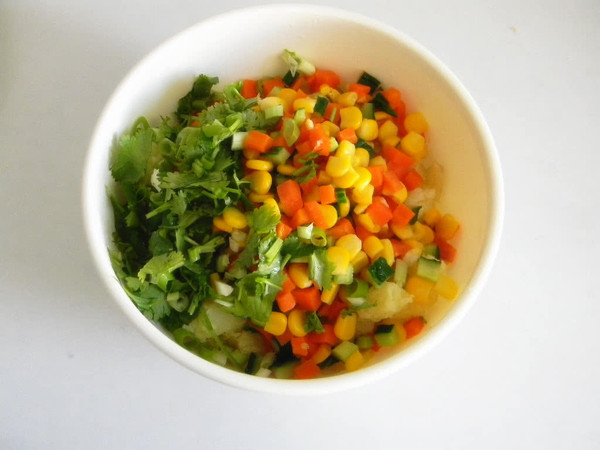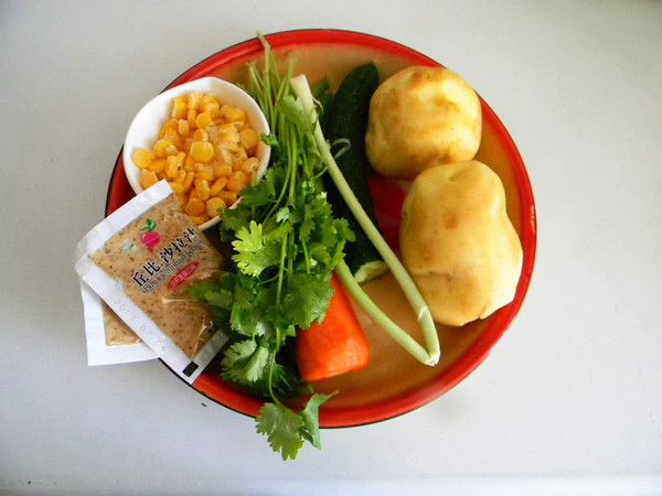 材料备好:我用的是新鲜土豆2个,香菜,黄瓜,胡萝卜,熟玉米粒,香葱,丘比沙拉汁焙煎芝麻口味。