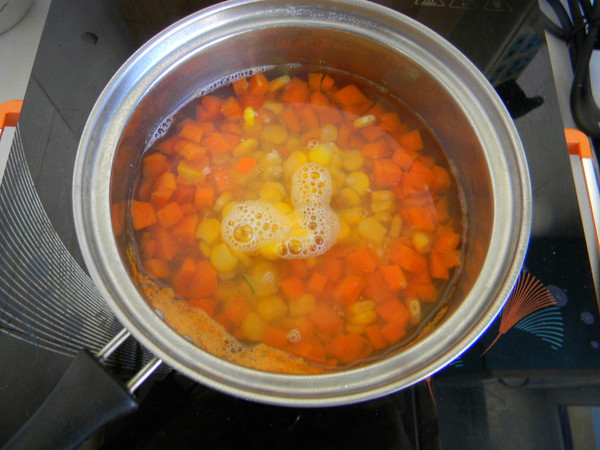 煮锅烧开水,放入胡萝卜粒,在烧开煮1分钟