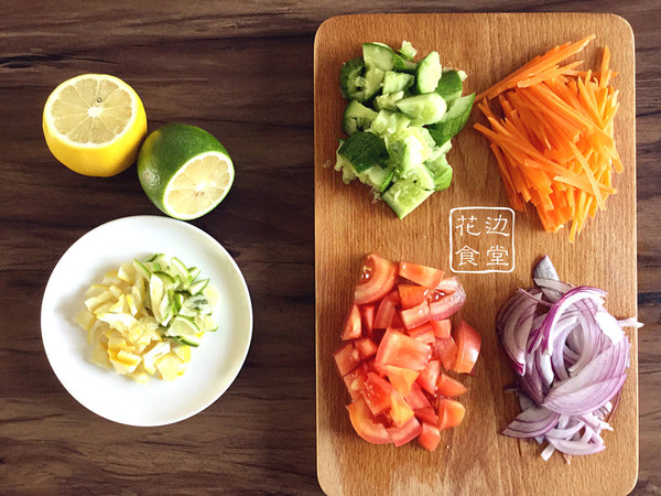 胡萝卜、洋葱切丝,水果黄瓜用刀身拍碎后切成小块,番茄切小丁,青、黄柠檬切成小碎片