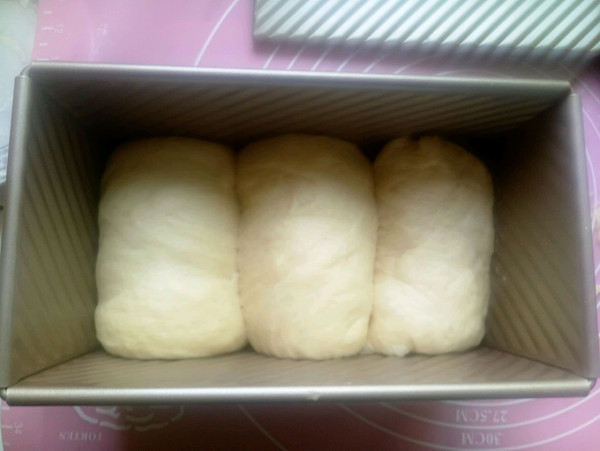 卷好的面团依次放入到面包模具中,盖上保鲜膜进行二发。