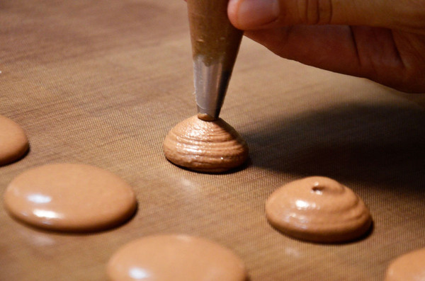 面糊倒入装圆嘴的裱花袋,在垫油布的烤盘上均匀挤出圆饼状。