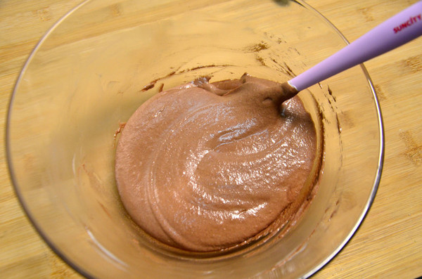 第三次加入后,轻快混拌,刮刀拉起面糊时,呈现丝带般飘落状态即可。