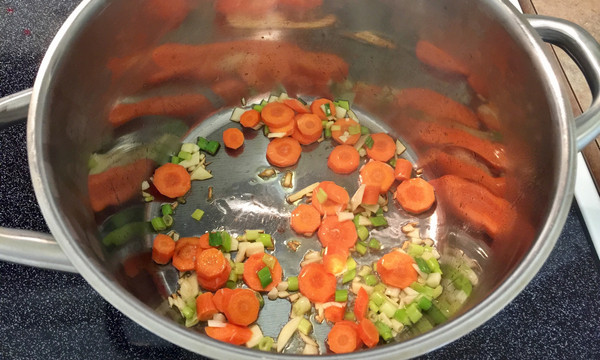 加入一半高汤一半水,大火煮沸,转中小火半盖上盖子,煮15分钟,加盐调味。