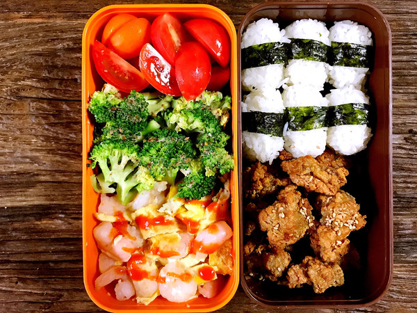 也有带中式便当的时候,我女儿的学校的餐厅给孩子们提供微波炉,会有老师协助使用。所以可以把饭菜放在两个盒子里,需要,不需要加热的一盒。图中是盐煎黄花鱼、北极虾仁、卤蛋、白灼西兰花(水里放一点油能保持翠绿),生抽蒜泥香油酱汁。