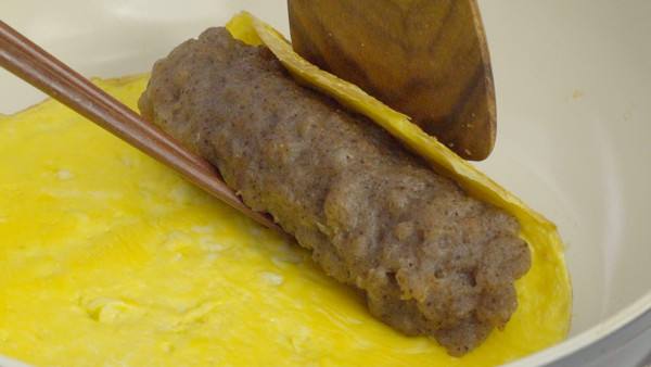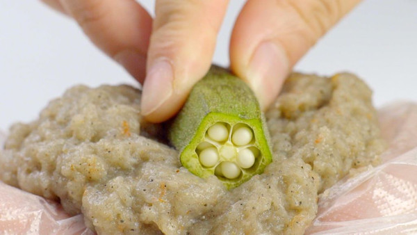 待蛋皮凝固,边缘摆上虾泥秋葵,轻轻卷起