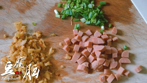 切配菜啦!我今儿放榨菜,火腿肠,再点上一点儿葱花!