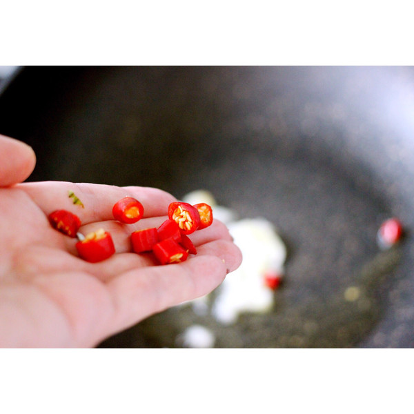 热锅凉油爆香蒜末后、加入红辣椒丁