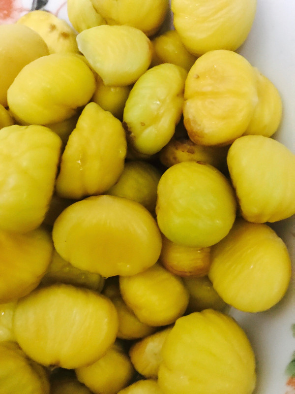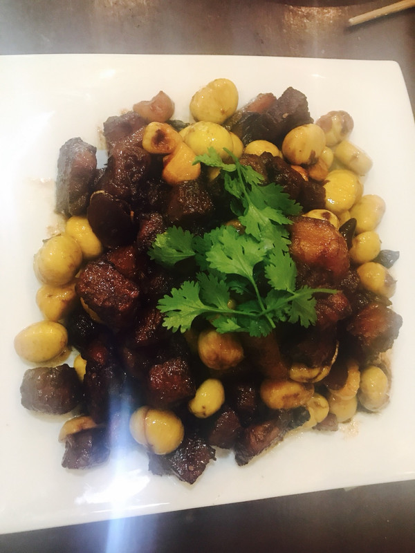 炒锅放少许油放冰糖,炒开后放入五花肉翻炒,再放入老抽生抽料酒(2:1:1)再放入一小碗水,小火半小时,再放入板栗和一小碗水,小火半小时即可出锅