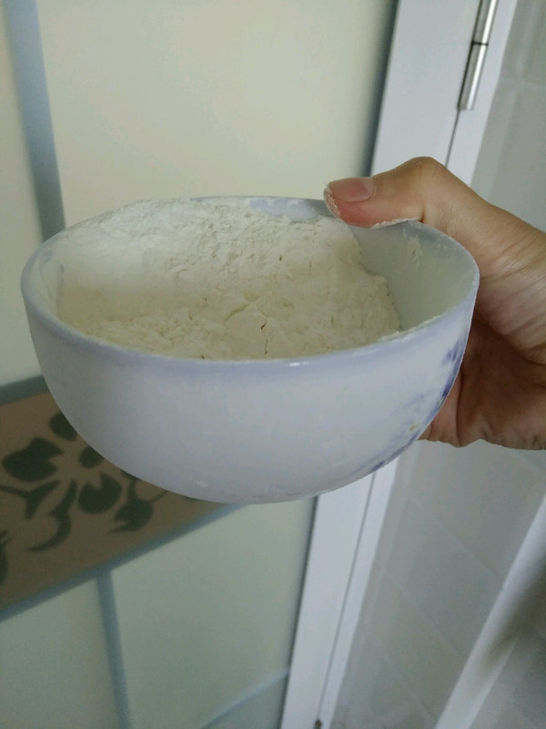 把白菜叶块和面放到大一点的盆里,边倒水边和面菜,让他们可以黏一块成为一个大团子,放置一会再揉一揉,备用