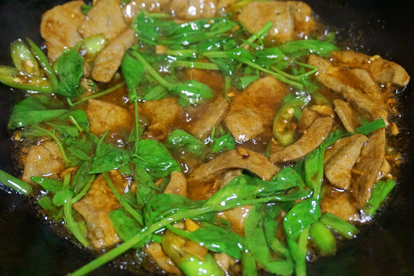 最后下葱节、豌豆苗翻炒几下即可出锅 叨叨叨:豌豆苗可以增加成菜的色泽、口感和口味,是个很不错的搭配