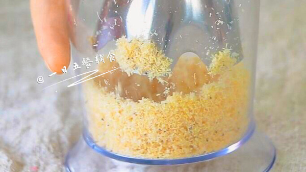将无盐淡虾皮搅拌成粉末。如果虾皮比较咸,需要先将虾皮咸味泡掉,炒干后再打碎。 小贴士:虾皮补钙效果排名第一,但不太好消化,不管宝宝月龄多大,打成粉末更好消化。