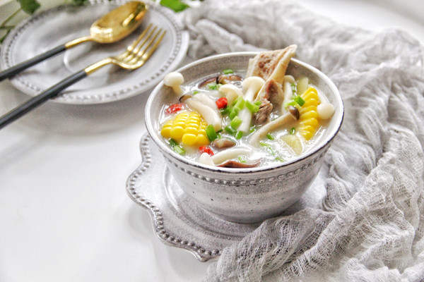 加入香菇和玉米,大火烧开转中火将菌菇炖熟