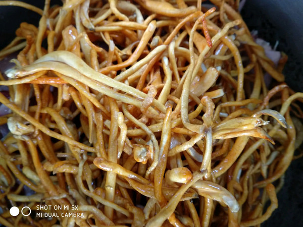 鲜虫草花洗净加入锅中,加水开始炖煮。