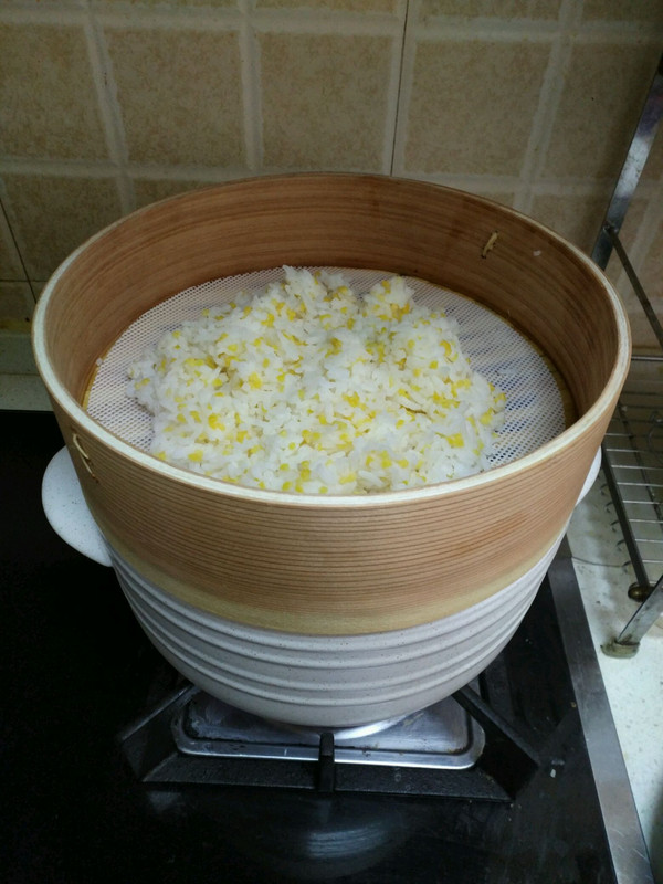 把玉米渣和大米沥干水分捞出,放在蒸笼里。