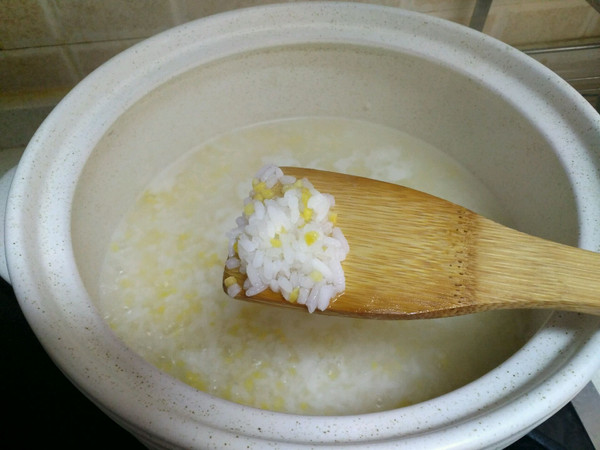 等20分钟后,可以看见玉米渣和大米同时煮至半熟状态。
