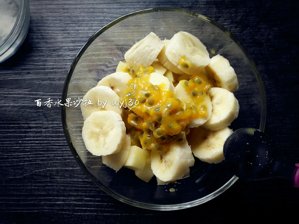 苹果洗净去皮,切成小块,倒入玻璃碗中。