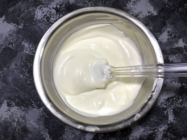 将酸奶糊与淡奶油混合,翻拌均匀。