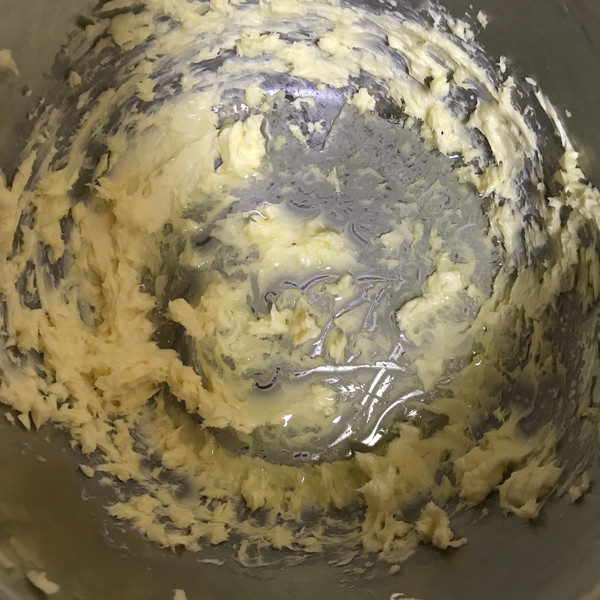 黄油室温软化,加入细砂糖和奶粉,用打蛋器打发,直到体积膨松,颜色略变浅