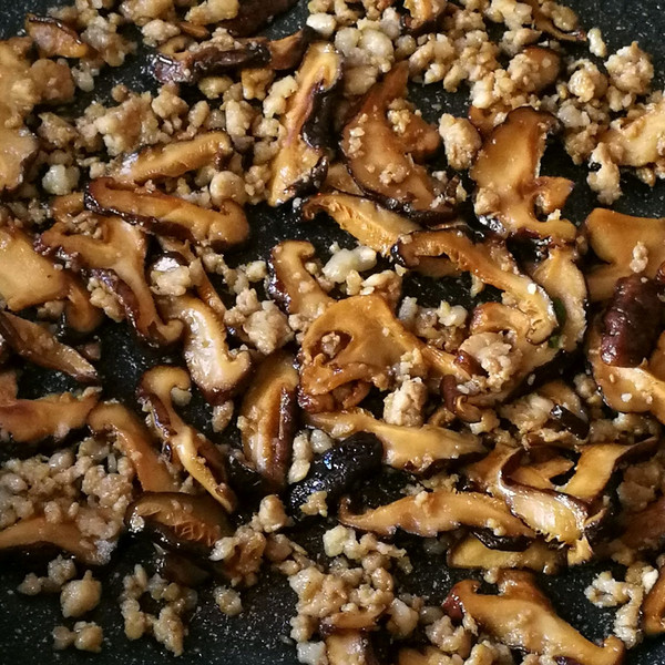 倒入煎蛋和香菇肉末一起翻炒,可以根据实际情况加人适量的开水,保持湿润爽滑,再加入生抽,耗油,胡椒粉等调料炒均匀即可。
