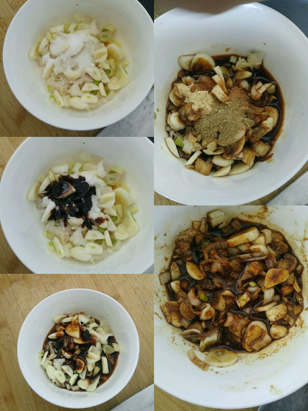 切好葱姜蒜(分两份),其中一个倒入盐,酱油,醋,姜粉,茴香粉,花椒粉(具体量看炒的肉的多少而定),拌匀。