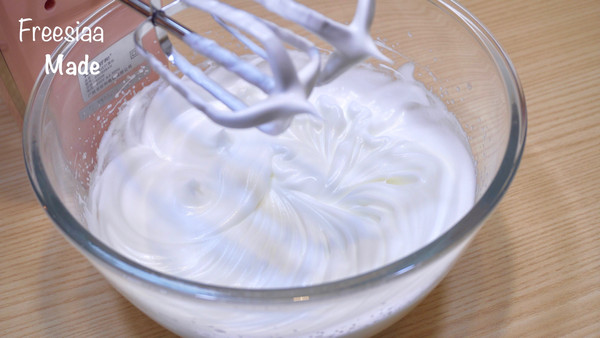 打发蛋白,(触碰到蛋白的器具需要保证无水无油),打发出现细密小泡时,加入1/2糖粉,出现纹路时,再加入剩余糖粉,最终打发后,提起打蛋头,有直立的尖尖角(注意不要过度打发,有明显纹路后就改用低速,多次停下检查蛋白状态,蛋白霜应当是有弹性,细腻的样子,如果呈现块状,变得粗糙就是过度打发了)。