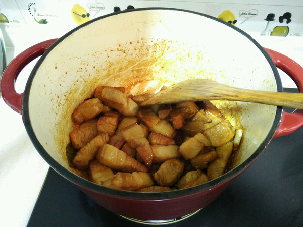 将焯水后的五花肉倒入锅中,小火翻炒至肉块均匀裹上糖色;