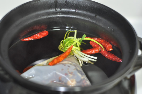 锅中放水,水不用太多,没过牛肉即可,放入葱,姜片,干辣椒,香料包,放入一勺料酒、两勺生抽、一勺老抽,一小把冰糖、适量盐,卤汁偏咸即可;