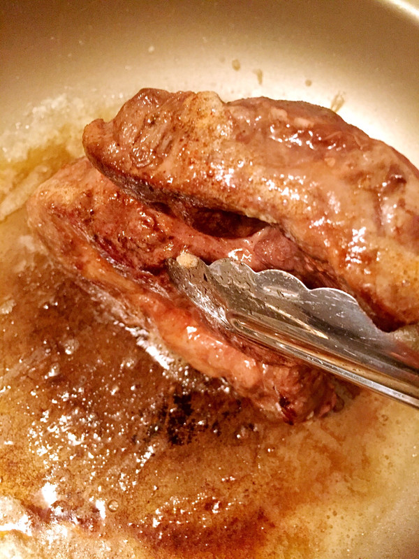 溶化后放入水浴后的牛排,单面煎20-30秒