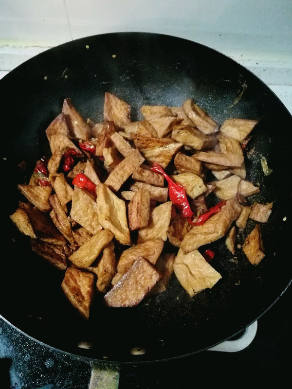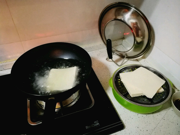 豆腐切厚片,开水轻煮1分钟,凉一会。