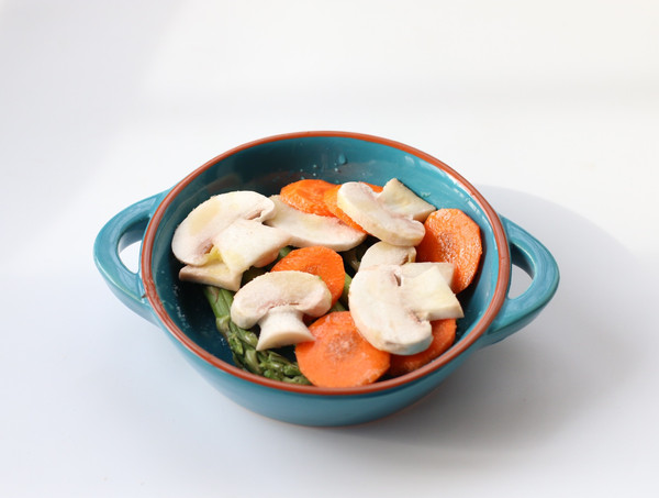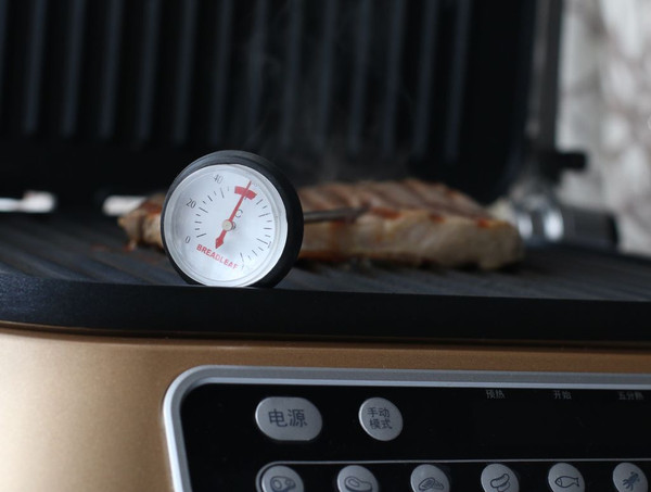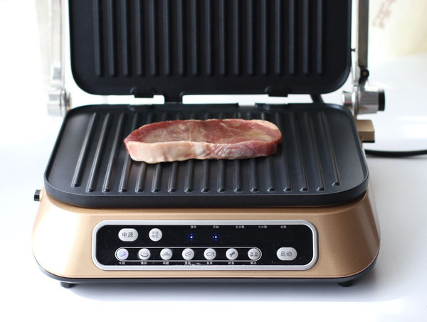 预热结束,机器会发出提示音,开始键灯光闪烁,打开盖子上摆放好牛排。