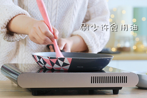 起锅开小火,刷一层薄薄的食用油。 »这一步小火(同款电陶炉3档)很关键哦,妈妈们不要心急开大火,往往容易出现外焦里不熟的情况。